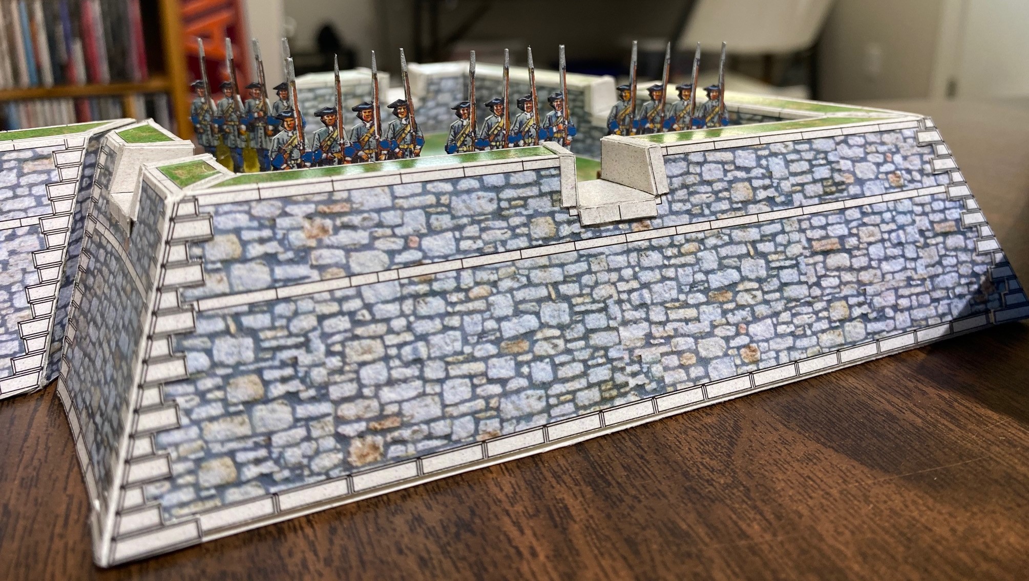 River is made of window tinting cut to size. Town buildings are scratch made by Mal Wright for my Boxer collection. Crops are cut out from a door mat and spray painted green. Bridges and Pogoda are aquarium pieces. Normally each unit is 4 stands, but I had to make units 3 stands to allow for maneuvering as I only have an 8' x 5' table. Sigh. I used to have 14' x 5' in my old basement.